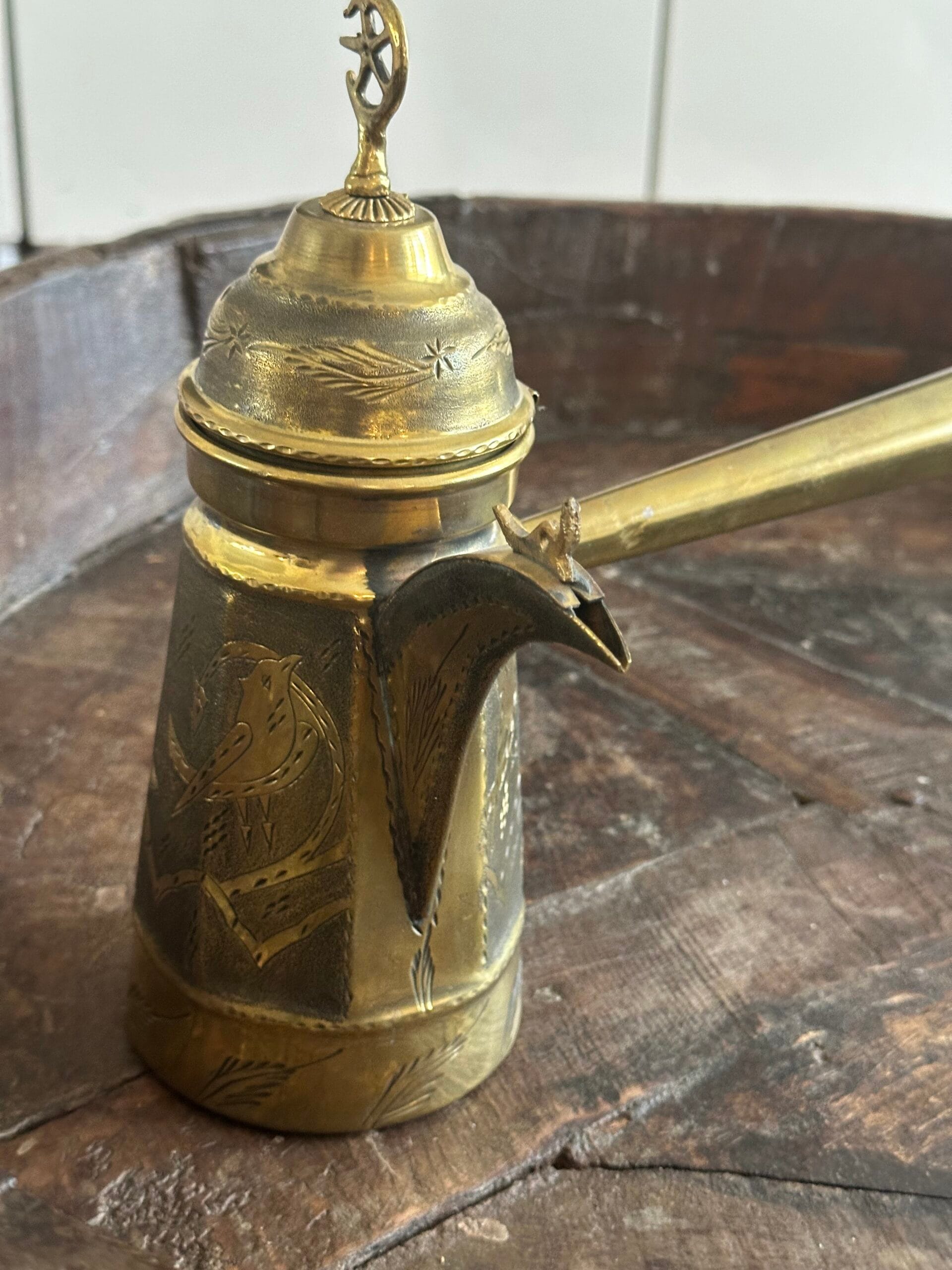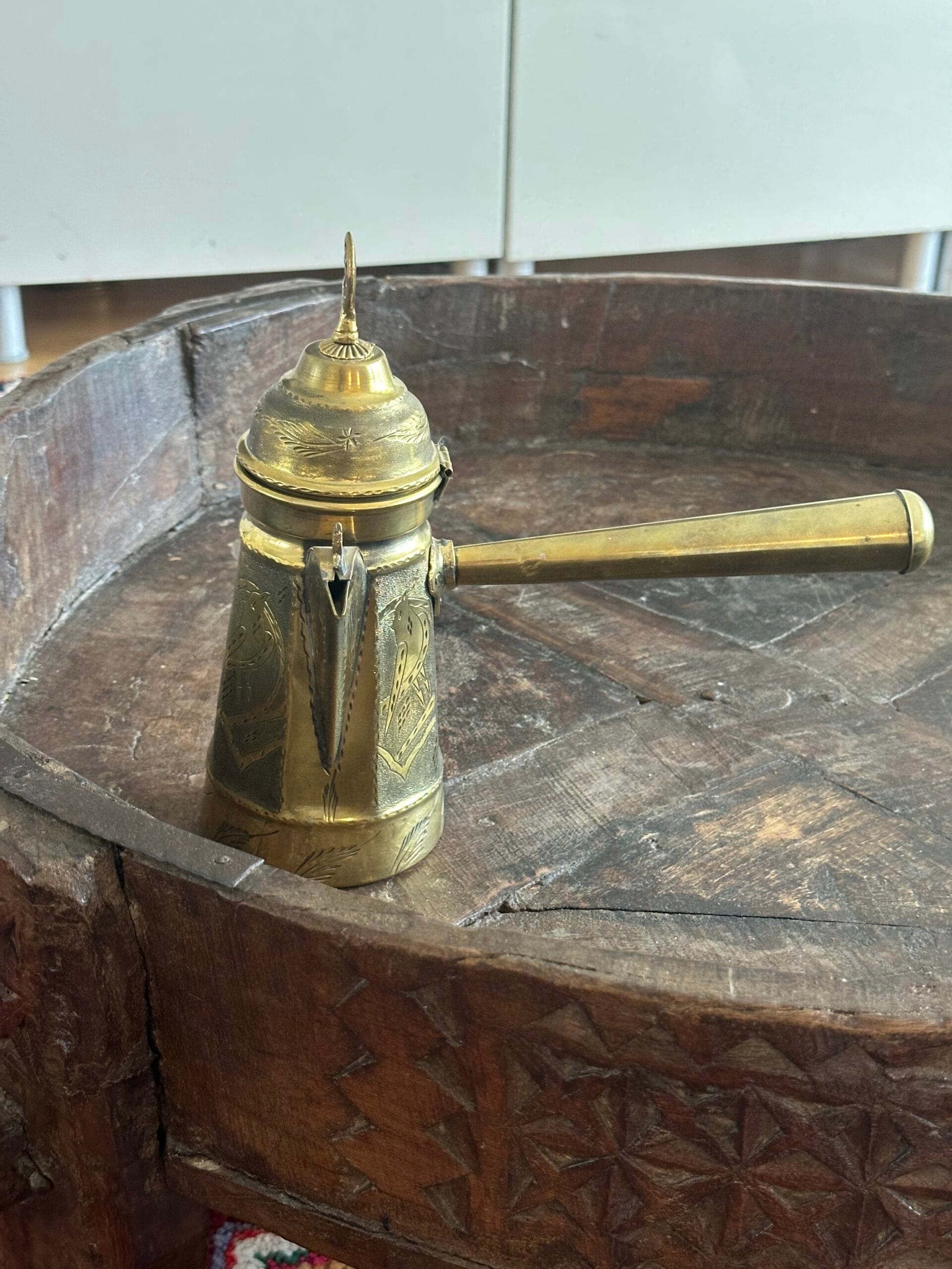 - Authentique cafetière traditionnelle en cuivre d’origine algérienne, finement décorée de motifs gravés artisanaux. Cette cafetière orientale, proche du modèle appelé cezve, était traditionnellement utilisée pour préparer le café oriental, comme le célèbre café turc.