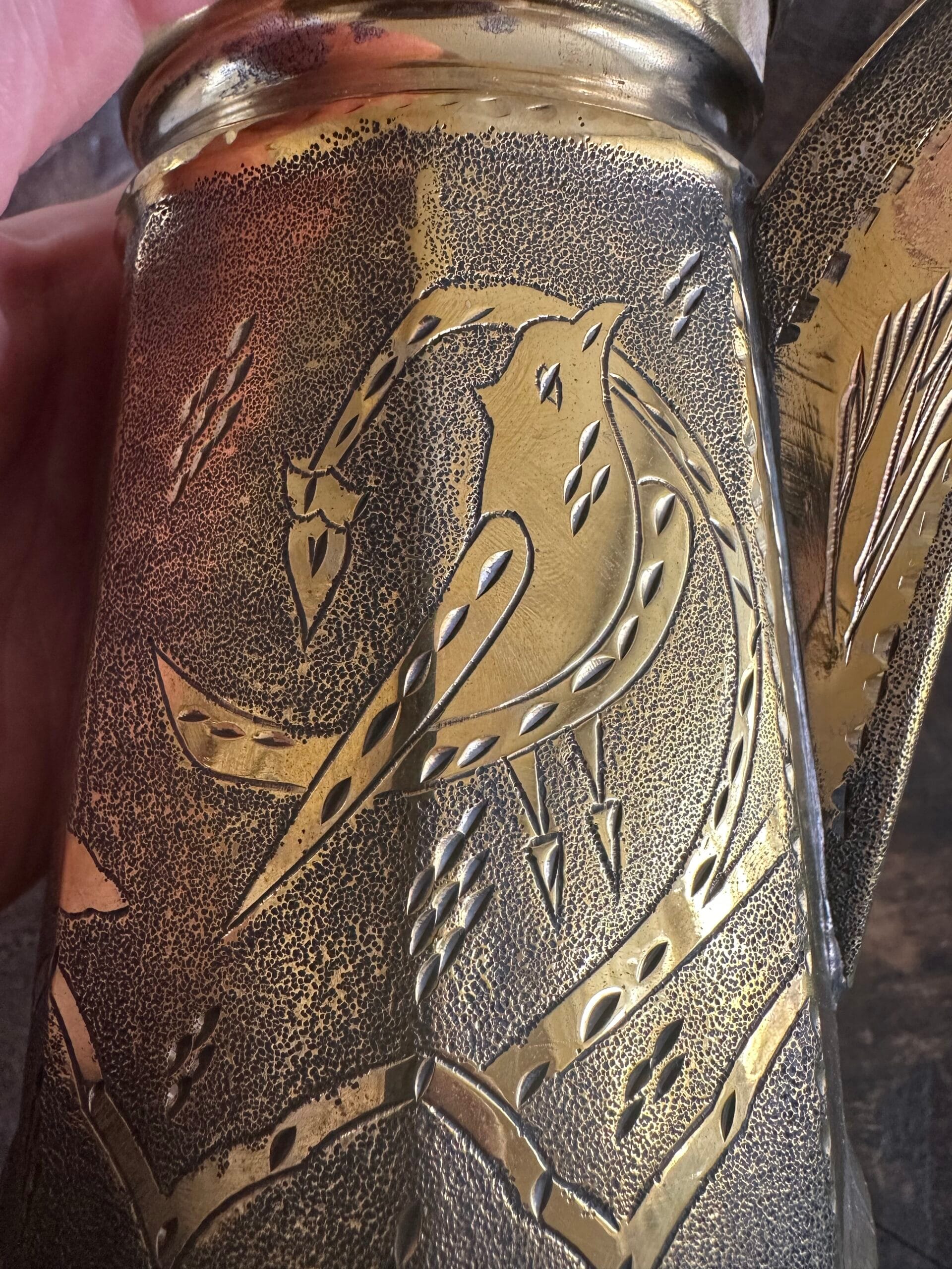 Elle se distingue par son long manche conique, son bec verseur fin et son couvercle décoratif surmonté d’une petite poignée sculptée. Les gravures représentant des motifs floraux et un oiseau(maknin) témoignent du savoir-faire de l’artisanat algérien .