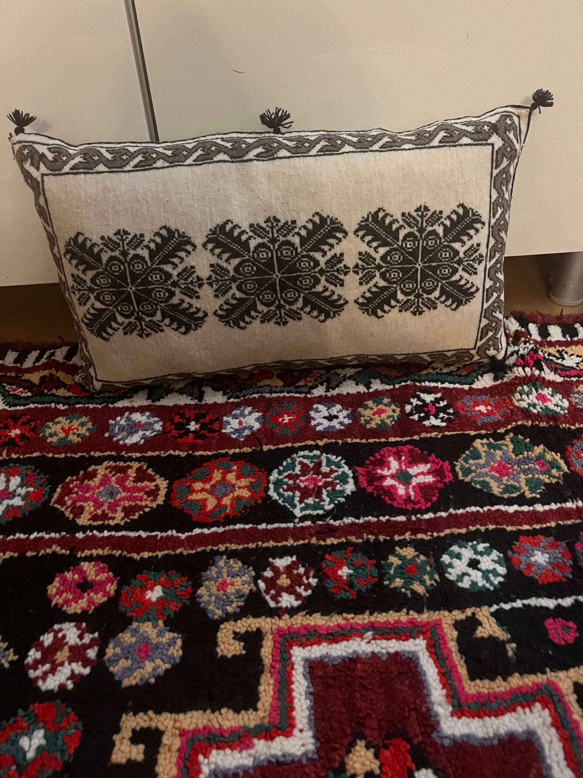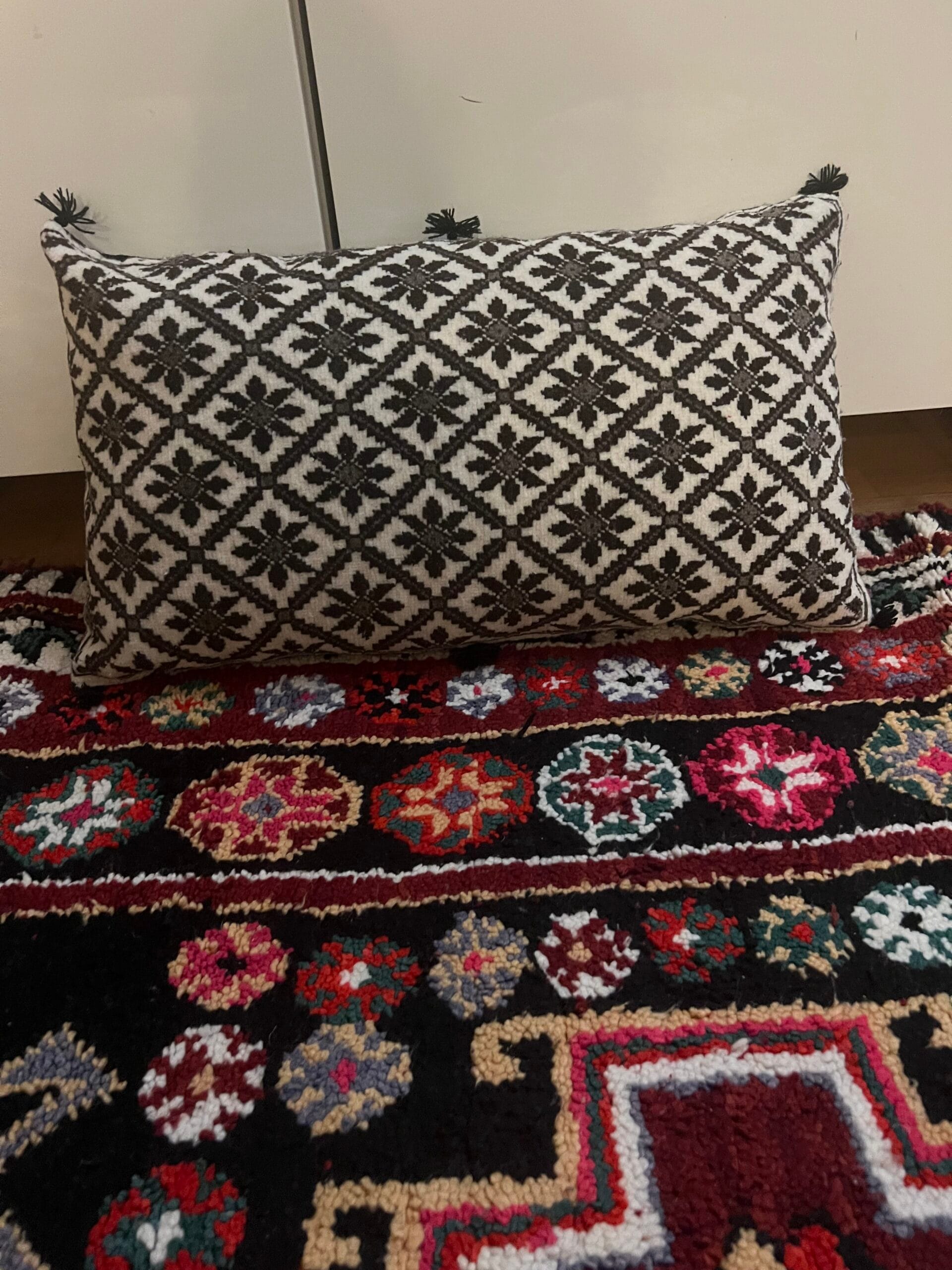 Magnifique coussin  recto verso en tapis de babar recyclés, en pure laine et pigments naturels .