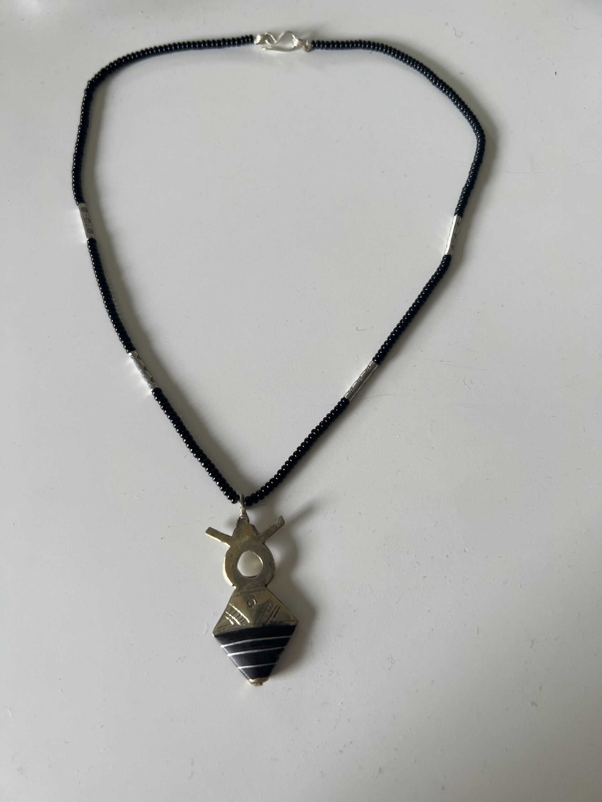 Croix du sud en argent et bois d’ébène naturel Montée sur un collier de perles noir et 4 perles tubes en argents.