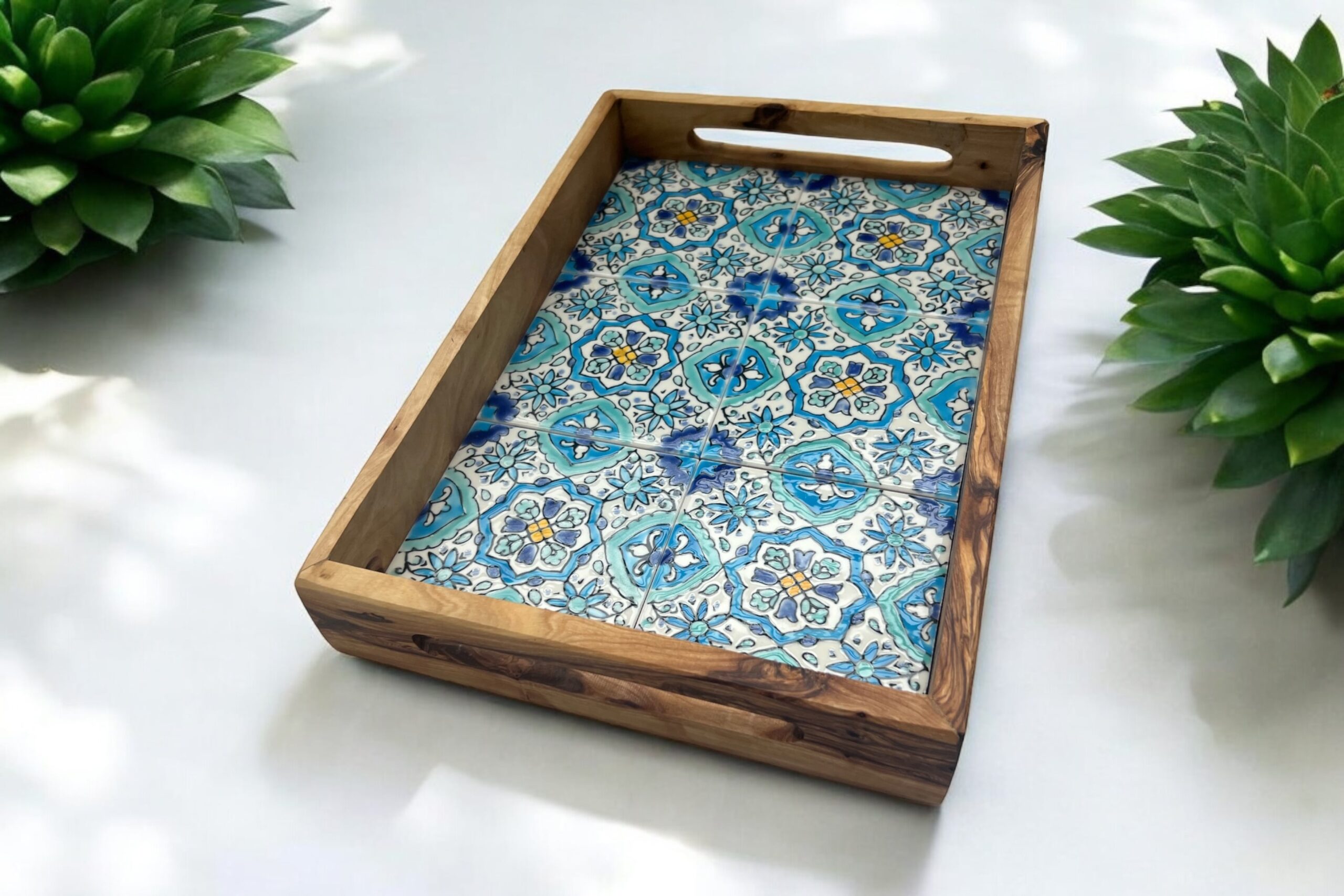 Plateau fait entièrement à la main en bois d’Olivier et céramique Algérienne.