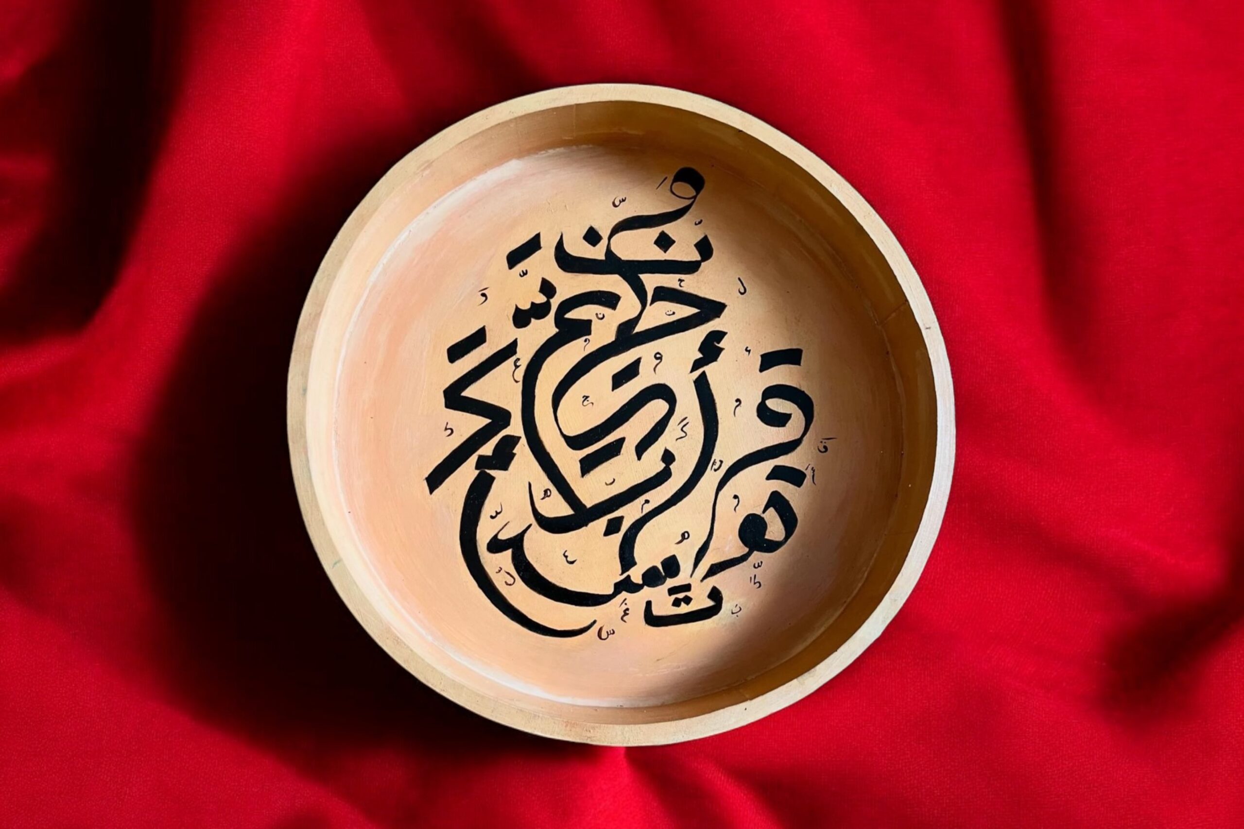 Plateaux en bois couleur nude et calligraphie arabe peints la main par la très talentueuse Mme Hania Barkat.