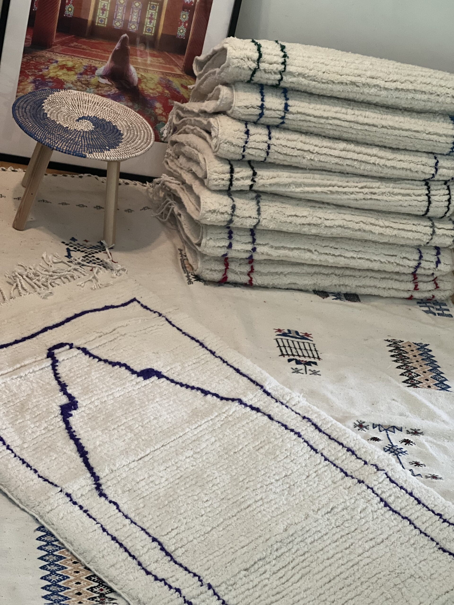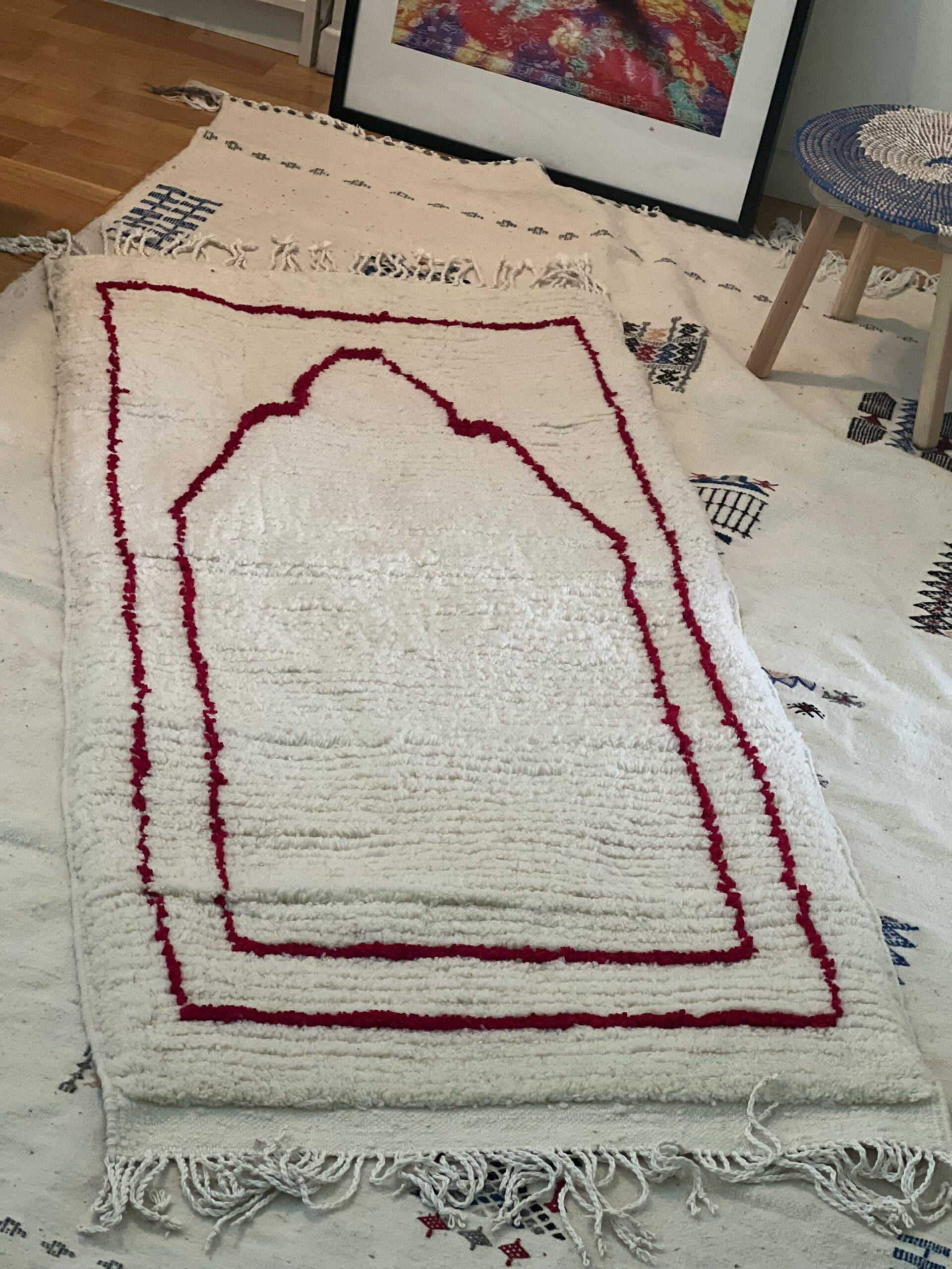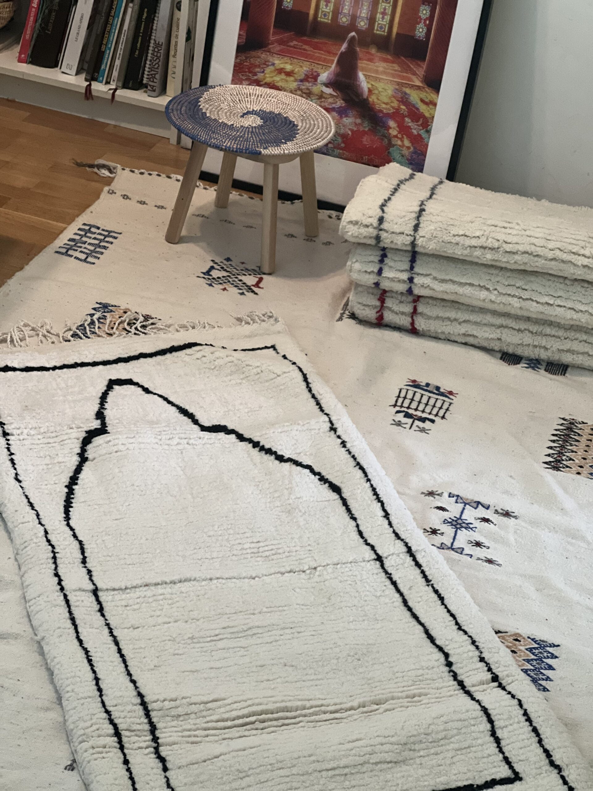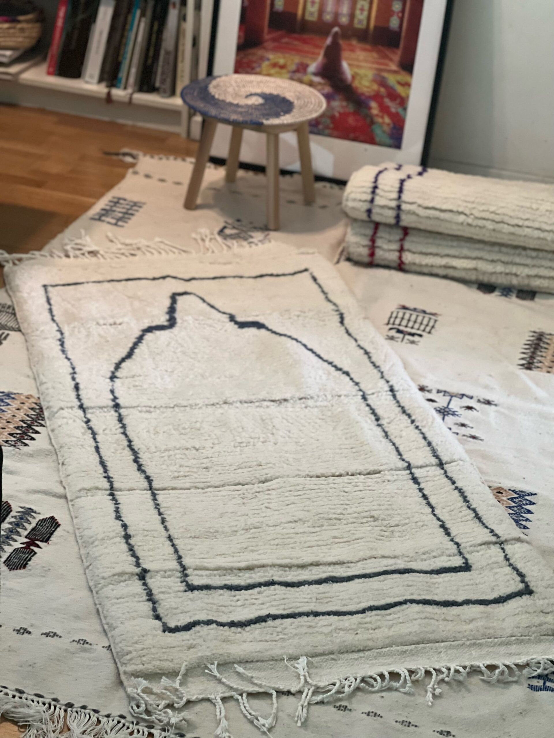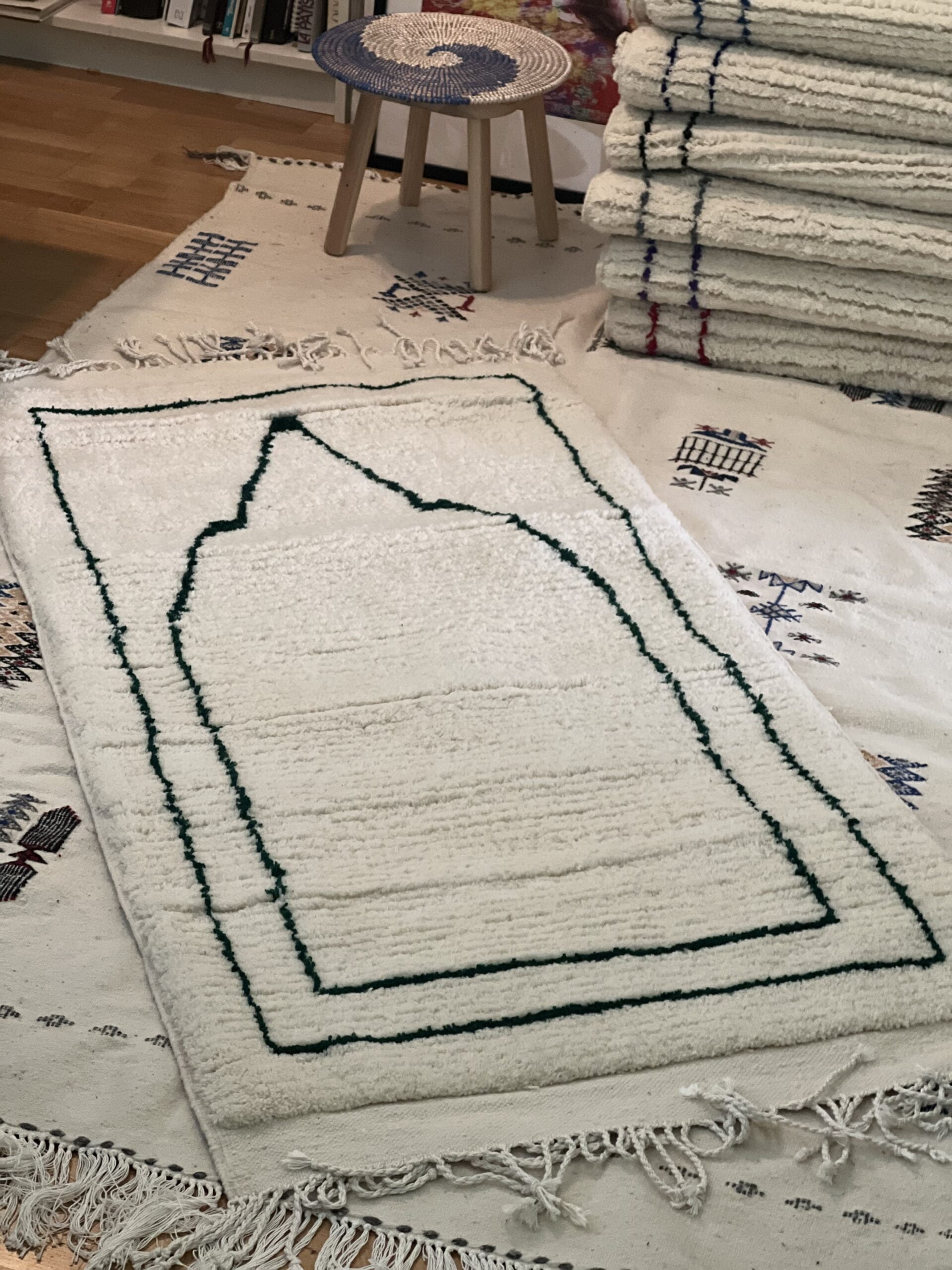 Nos tapis Imane sont faits en haute laine et noués à la main par des tisserandes de la région de Laghouat spécialisées dans les tapis en haute laine.